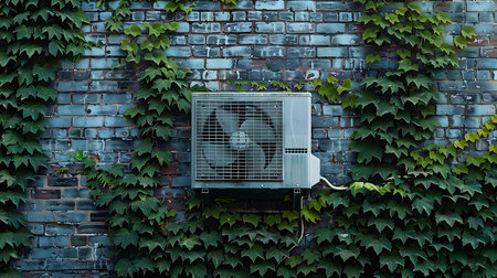 Air conditioner unit on brick wall covered in vines