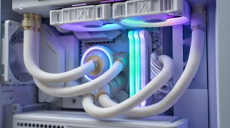 Explore a sleek and modern computer hardware liquid cooling setup with vibrant RGB lighting and tubes designed for optimal performance in gaming and creative tasks.