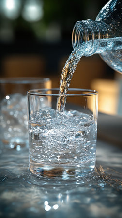 A close-up of water pouring into a clear glass from a bottle