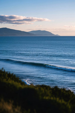 beautiful scenary of the Pacific Ocean and thick native vegetation shot from a vantage point during a hike in Southern Tasmania in Kingston Beach