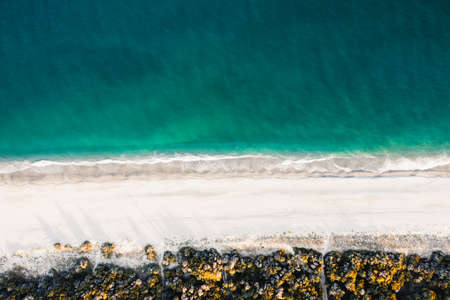 A relaxing aerial beach picture serves as the banner for the summer break. Amazingly blue ocean waves the seashore and the shoreline. superb top view from an airborne drone. calm beach seashore br