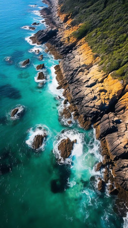 An aerial shot showcases a rugged coastline where vibrant turquoise waves surge against dark, textured rocks. The composition displays dynamic patterns of water and stone with overhead lighting. Suitable for environmental themes, it provides a visual for travel, nature, and coastal projects, offering versatile applications.