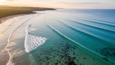 An aerial panorama of a serene coastline with gentle turquoise waves rolling onto a sandy beach, featuring rocky outcrops and a warm sunset sky casting soft light.