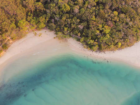Aerial view of beautiful turquoise sea ocean, beach and tree forest walk, Top view from drone