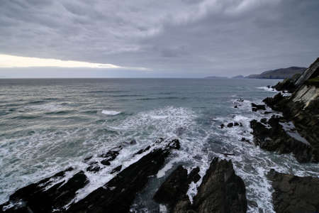 Beat of waves at rocky beach in Dingle peninsula during windy sunset