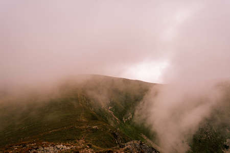 Magical overcast landscape of the Montenegrin ridge in the Carpathians, picturesque landscapes from Gutin Tomnatych, the Carpathians after the summer morning rain. 2020