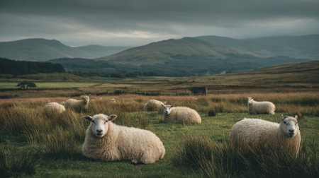 A serene scene featuring a flock of sheep grazing in a lush field surrounded by gentle hills and a dramatic cloudy sky, evoking tranquility and connection to nature.