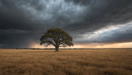 Beneath an imposing sky filled with dark storm clouds, a lone oak tree rises majestically, surrounded by vast golden fields, evoking a sense of solitude and strength.