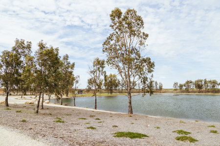 ancient red gum eucalyptus tree growing on a river bank on a sustainable agricultural farm in outback australia
