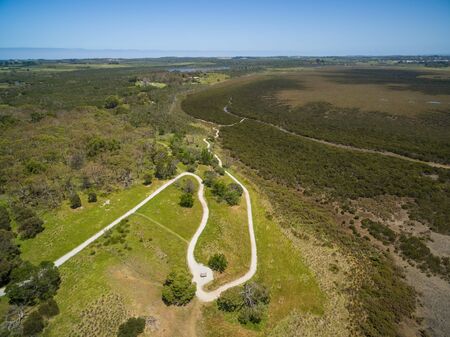 Aerial view of mangroves and winding walking trail at Rhyll. Phillip Island, Victoria, Australia