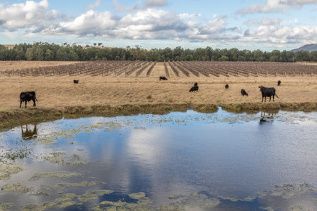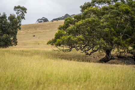Yellow grass pastures with cattle and trees under blue sky in Victoria, Australia