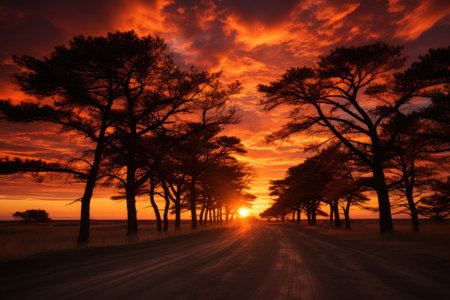 A stunning silhouette of a solitary tree against a vibrant sunset on a tranquil countryside landscape, showcasing warm colors and peaceful ambiance.