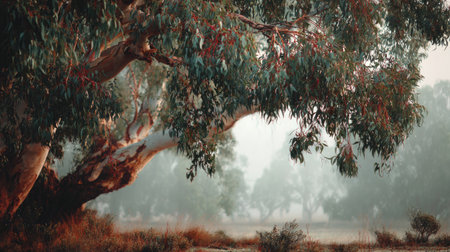 The River red gum in light fog, dew on leaves, light soft diffused, three-quarter view