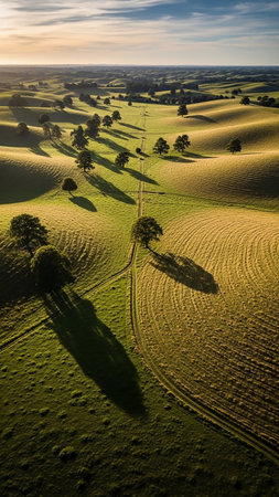 Golden hour light bathes rolling hills and fields, casting long shadows from scattered trees and highlighting winding dirt tracks across the landscape.