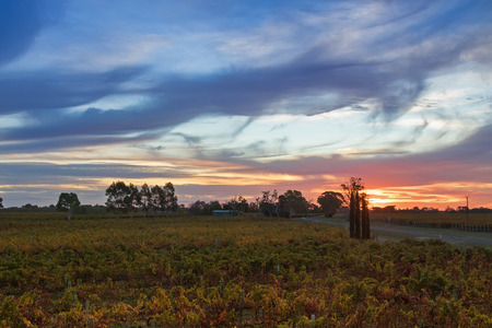 Sunset view of vineyard in the evening. These wine grapes are growing on limestone coast in Coonawarra winery region during Autumn in South Australia