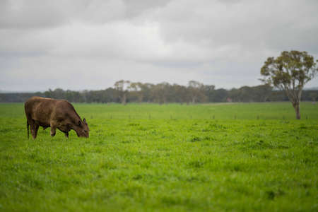 Stud beef cows and bulls grazing on green grass in Australia, breeds include speckled park, murray grey, angus and brangus.