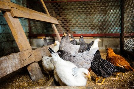 A flock of chickens is moving around the pens. Concept farming.