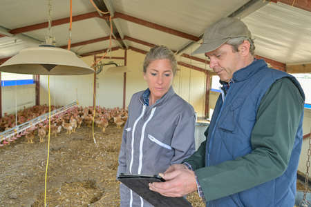 Veterinary and female farmer analyzing the growth of the chicken breeding on a digital tablet