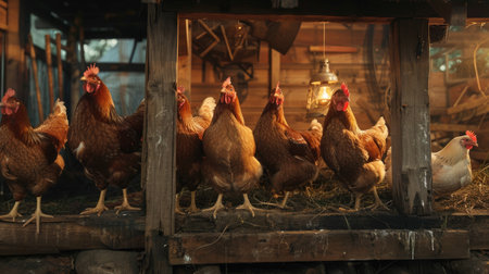 Chickens roosting in a cozy coop at dusk, portraying the end of a productive day on the farm.