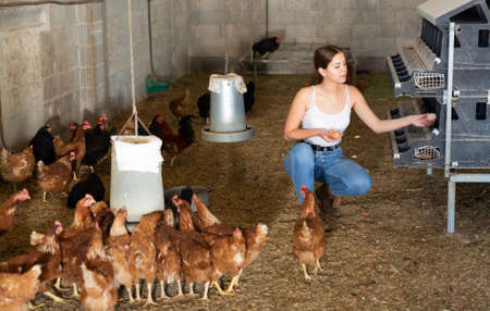 young woman farmer worker in gloves taking care of chicken during work in henhouse, indoors