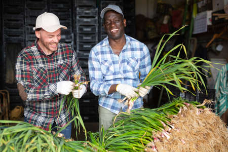 Positive farmers laughing while processing young garlic in warehouse