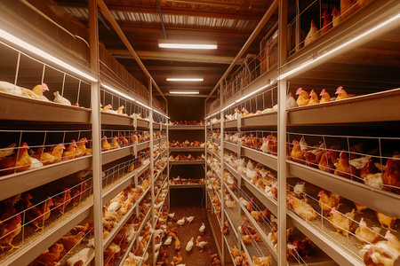 Industrial Chicken Farm with Rows of Cages