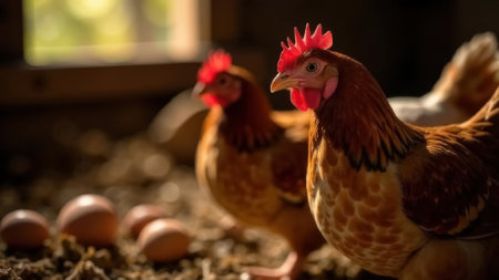 AI generated realistic hen standing in a rustic chicken coop with soft light filtering through the window highlighting its feathers. Natural shadows and textures enhance the cozy atmosphere.