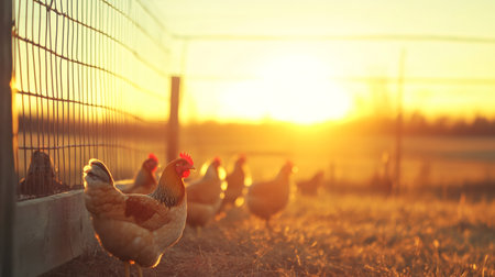 Chickens standing peacefully in a sunlit field during the golden hour, enjoying the freedom of free range farming and embracing an organic lifestyle in a tranquil rural setting