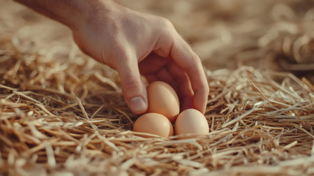 Close up of farmers hand gently placing a fresh brown egg on top of two others nestled in a straw filled chicken coop, showcasing organic farming practices and the collection of farm fresh eggs