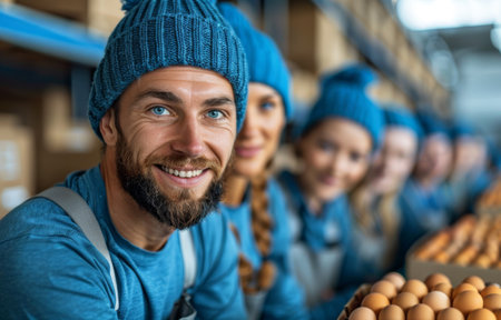 Group of cheerful workers wearing blue knit hats, sorting eggs in a warehouse. Focus on a smiling man in the foreground.