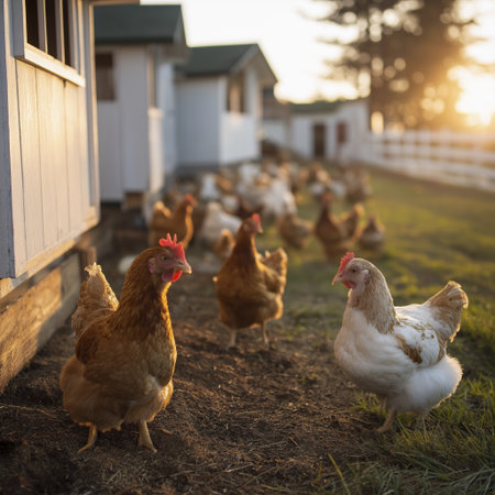 Free range hen in sunlit chicken yard near wooden coops at golden hour with flock roaming peacefully