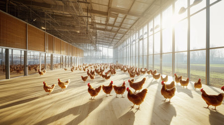 Chickens roaming freely inside a well-lit indoor farm, with wooden floors and natural light streaming in through the windows.