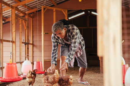 Asian elderly senior farmer feeding chicken at indoor house. Local farm.