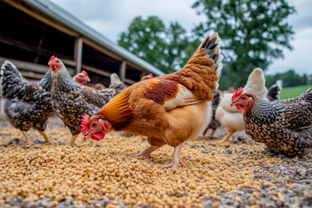 Brown Hen Farm, Chicken Laying Eggs in the Countryside, Organic Agriculture and Food Production, Surrounded by Roosters, Nature Rural Charm