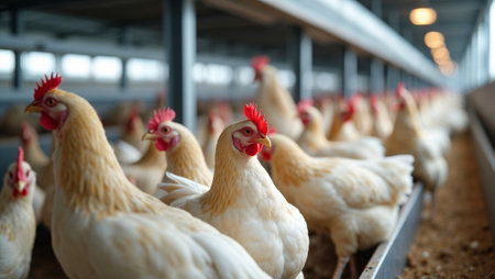 Chickens gather around troughs, enjoying a meal in a contemporary poultry barn. Automated feeders overhead ensure a continuous flow of nourishment in a clean, organized environment.