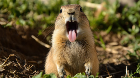 A charming close-up of a prairie dog yawning in its natural green habitat under bright sunlight, showcasing its adorable expression in a tranquil scene.