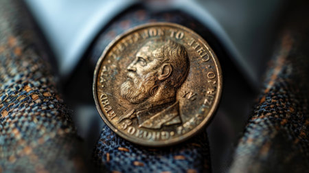 Detailed close-up of a gold coin placed on a business suit, signifying themes of wealth, finance, and business prosperity.