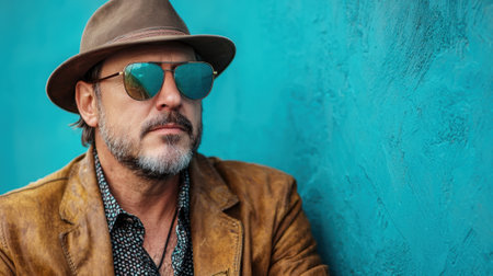A well-dressed man stands confidently against a bright turquoise wall, wearing sunglasses and a hat, showing urban style and character in daylight.