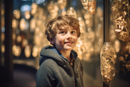 A smiling man in a festive hat looks up in wonder, surrounded by colorful bokeh lights and confetti.