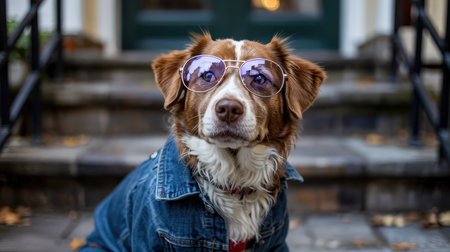 A fashionable dog showcases trendy sunglasses while sitting on stone steps of a house in a city environment.