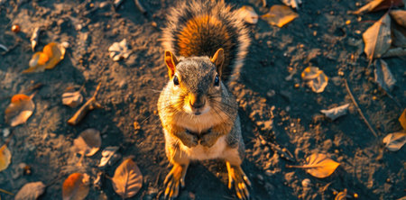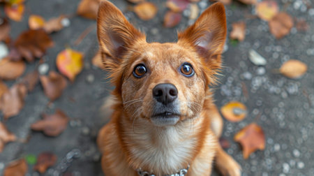 animal behavior, a curious ginger dog with a chain collar stands on a mix of dirt and concrete, looking up, surrounded by scattered leaves