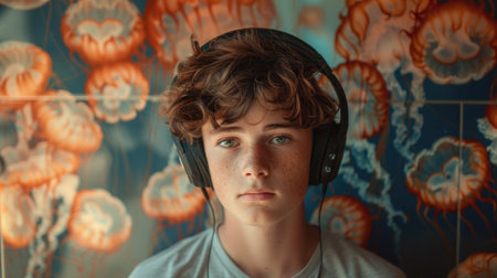 portrait of a teenager wearing headphones against the background of a painting with jellyfish