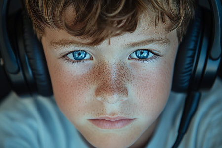 Close up portrait of a young boy with blue eyes engrossed in video games wearing headphones