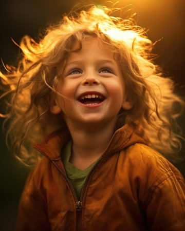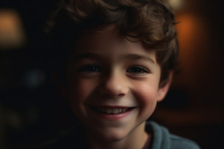 A young boy with curly hair smiles broadly, showcasing his joyful personality against a vibrant blue backdrop, capturing a moment of happiness and playfulness in an outdoor environment.