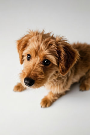 A brown Dachshund dog with intense blue eyes gazes upwards, its ears flopped down. The background is dark and textured.