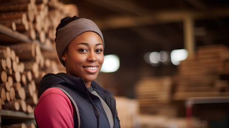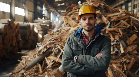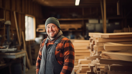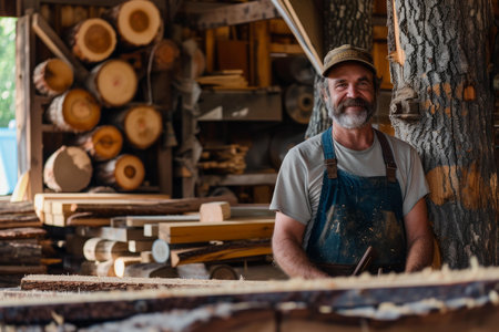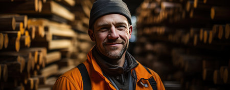 Industrious Sawmill worker portrait. Board tool equipment carpenter tree. Generate Ai