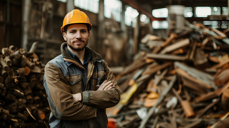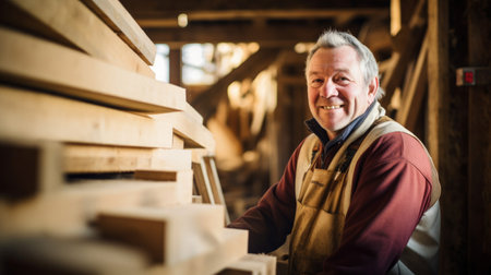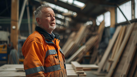 Seasoned craftsman in high-visibility clothing looks on thoughtfully amidst lumber. represents expertise in industry. A.I.