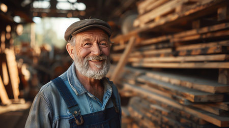 Elderly bearded man in overalls and flat cap, smiling in a timber warehouse, warm sunlight, low angle shot, natural wood background