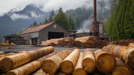 A sawmill with logs ready for processing, showcasing the industrial side of lumber production and timber manufacturing
