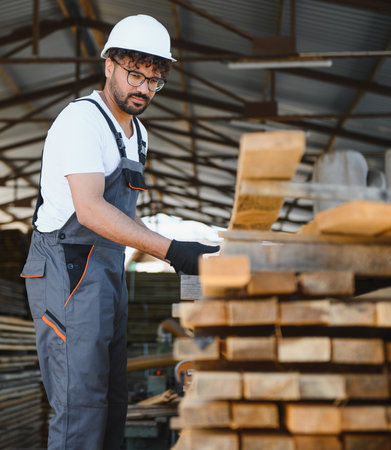 Carpenter wearing safety helmet and gloves, handling wooden planks in a timber warehouse, ensuring workplace safety and efficient lumber processing